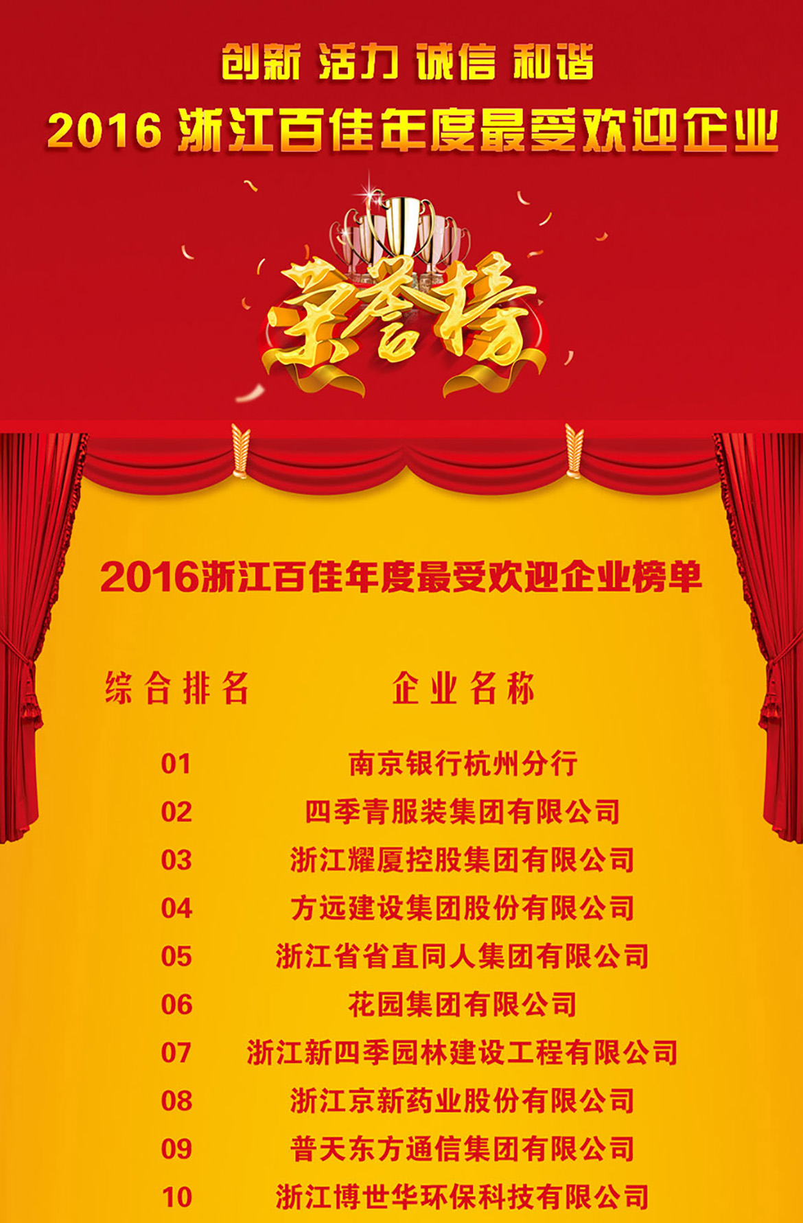 為推動浙江省企業(yè)的誠信和諧經(jīng)營,增添企業(yè)的創(chuàng)新發(fā)展活力和動力,由浙江經(jīng)濟網(wǎng)、新華網(wǎng)浙江頻道主辦,由中共浙江省委政法委員會、浙江省人大內(nèi)務(wù)司法委員會、浙江省人民檢察院、浙江省科學(xué)技術(shù)廳、浙江省公安廳、浙江省環(huán)境保護廳、浙江省住房和城鄉(xiāng)建設(shè)廳、浙江省國家稅務(wù)局、浙江省政協(xié)經(jīng)濟委員會、浙江省總工會、新華網(wǎng)等單位指導(dǎo),于2016年12月聯(lián)合舉辦的“2016浙江百佳年度最受歡迎企業(yè)” 榮譽榜推選活動日前揭曉,我公司在眾多參評企業(yè)中脫穎而出,取得了第十名的佳績。
