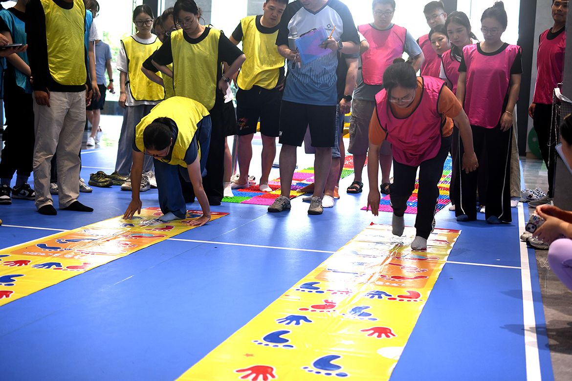 按照腳印/手印的方向指示,每隊(duì)成員按順序依次通過,以用時最短決定名次。
